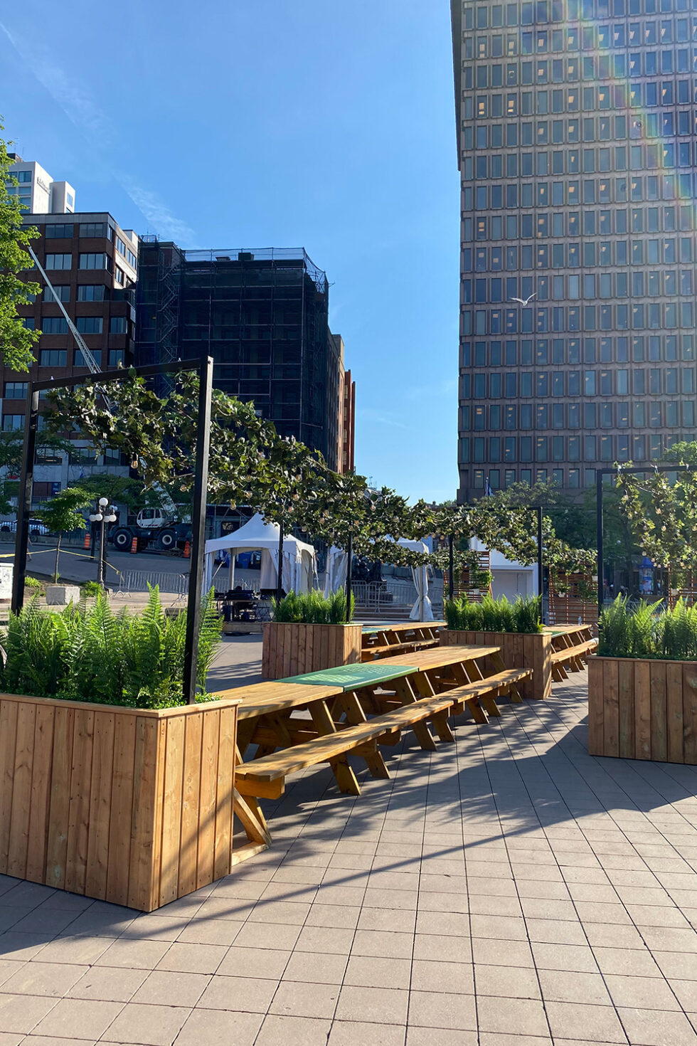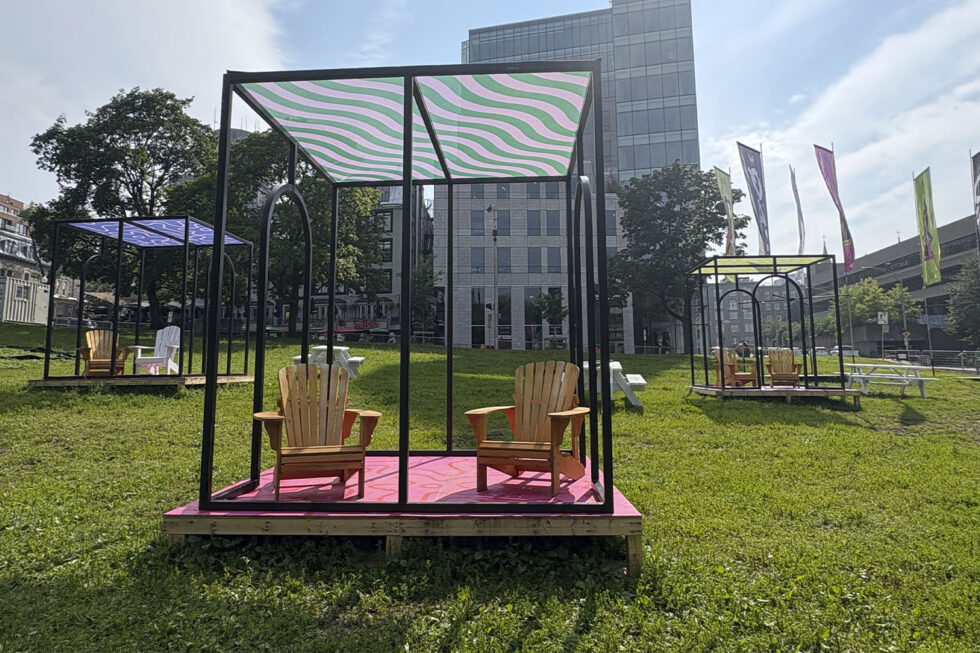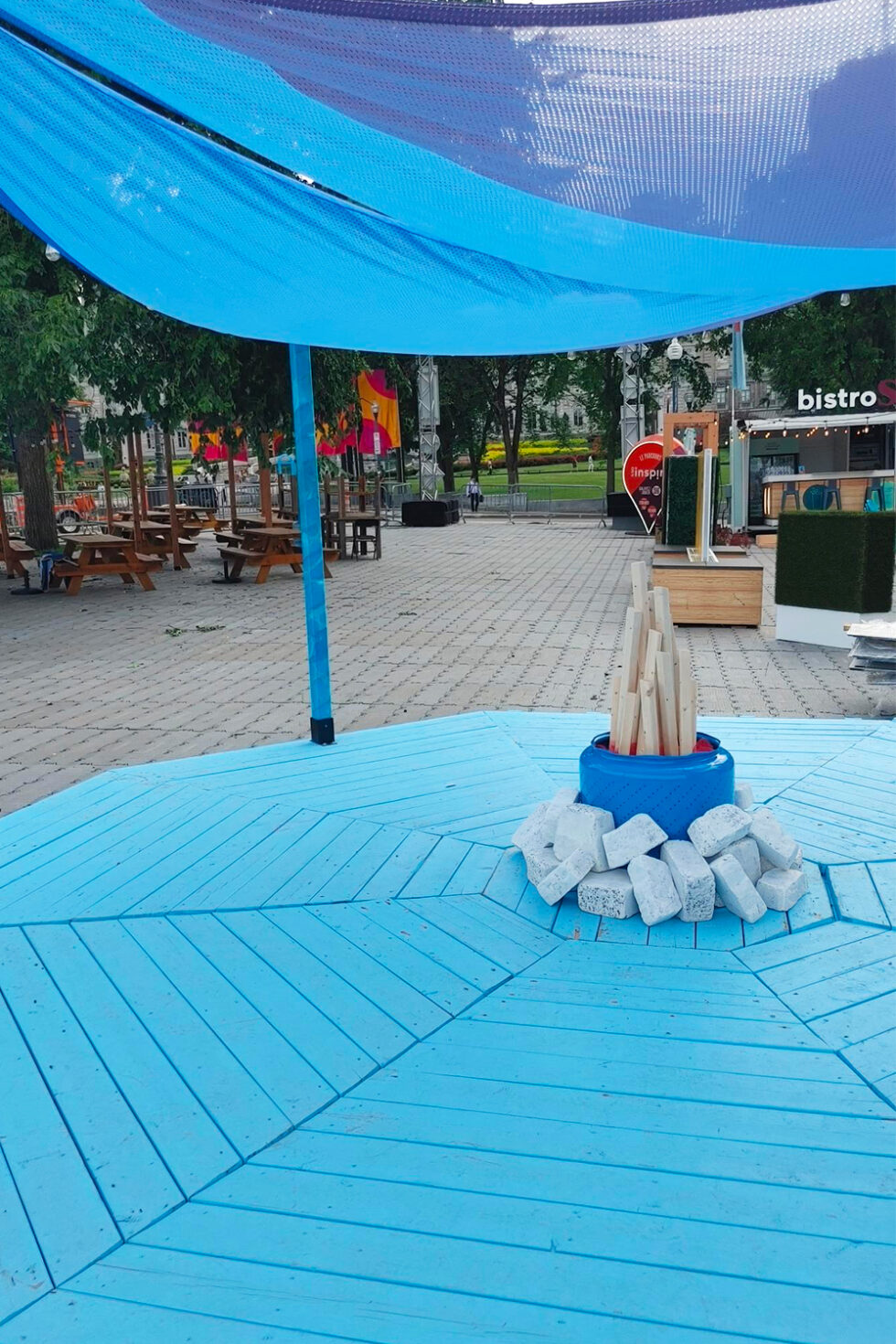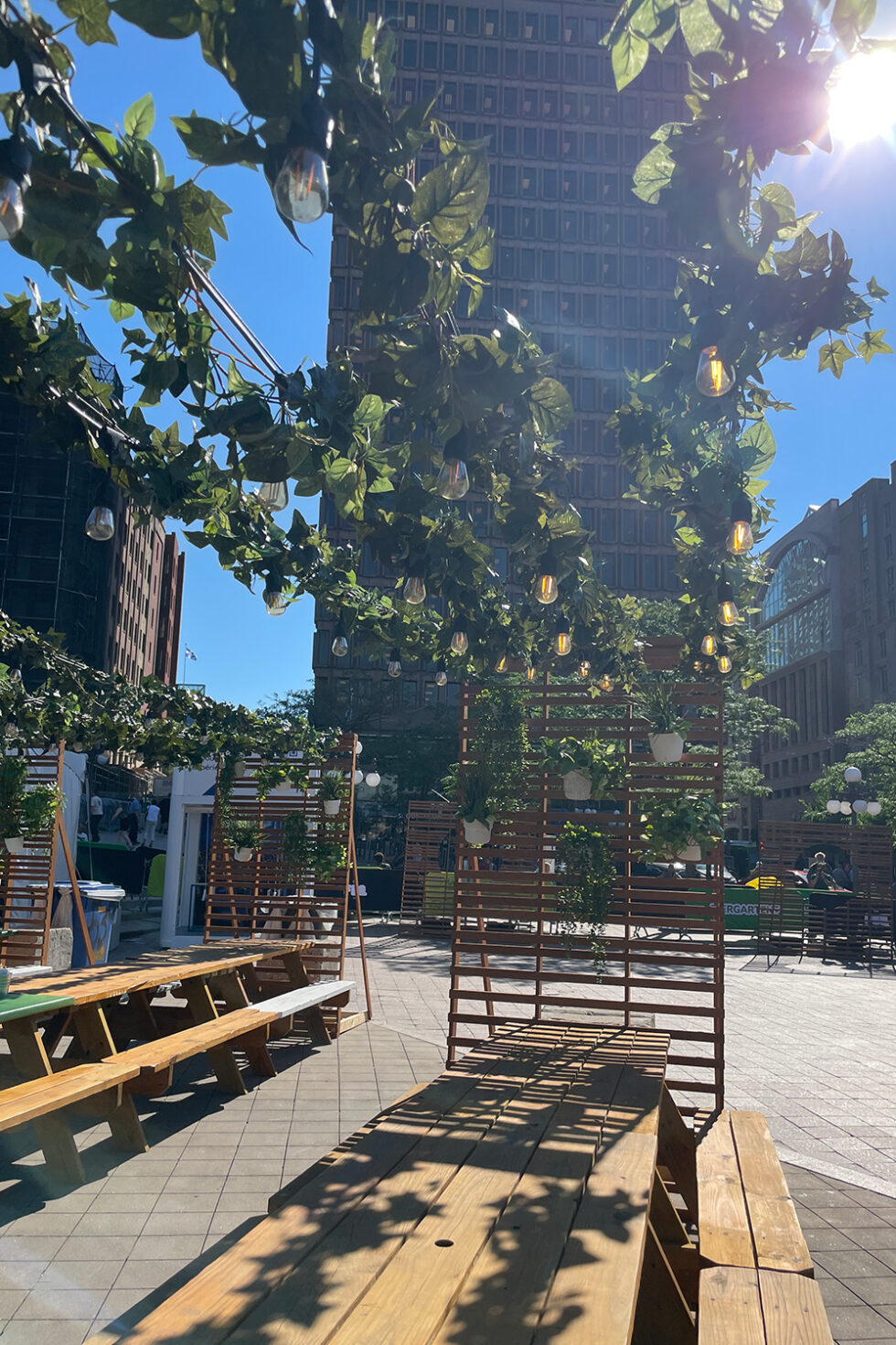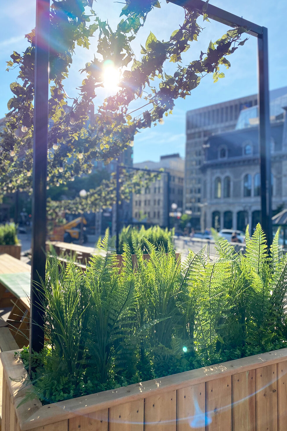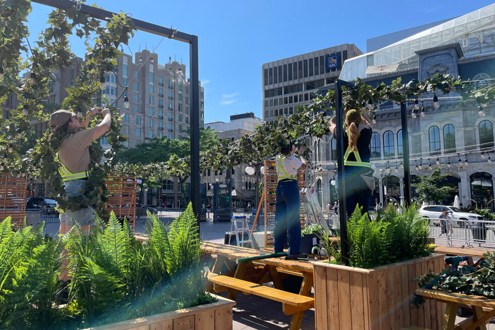 Installation d’un plafond de verdure, de jeux de tables, de palmiers et de feux de camp sur les sites de Place D’Youville, Assemblée nationale et Place George-V.