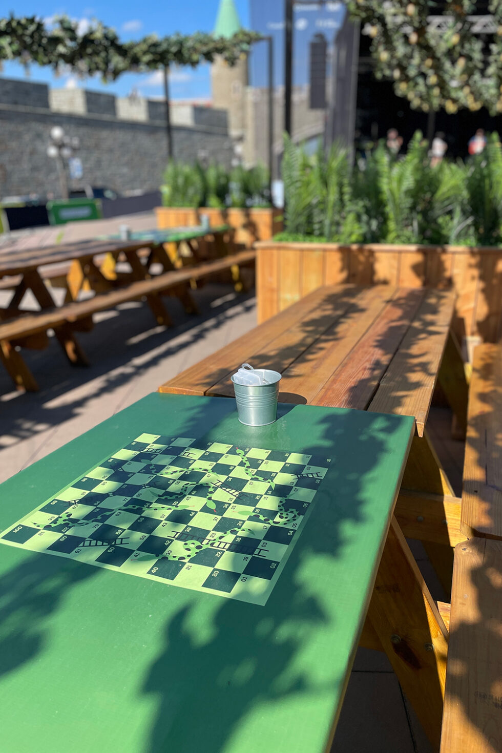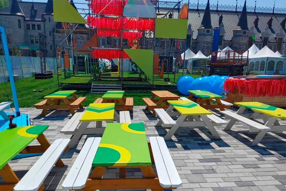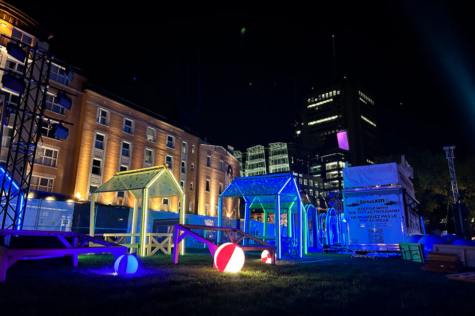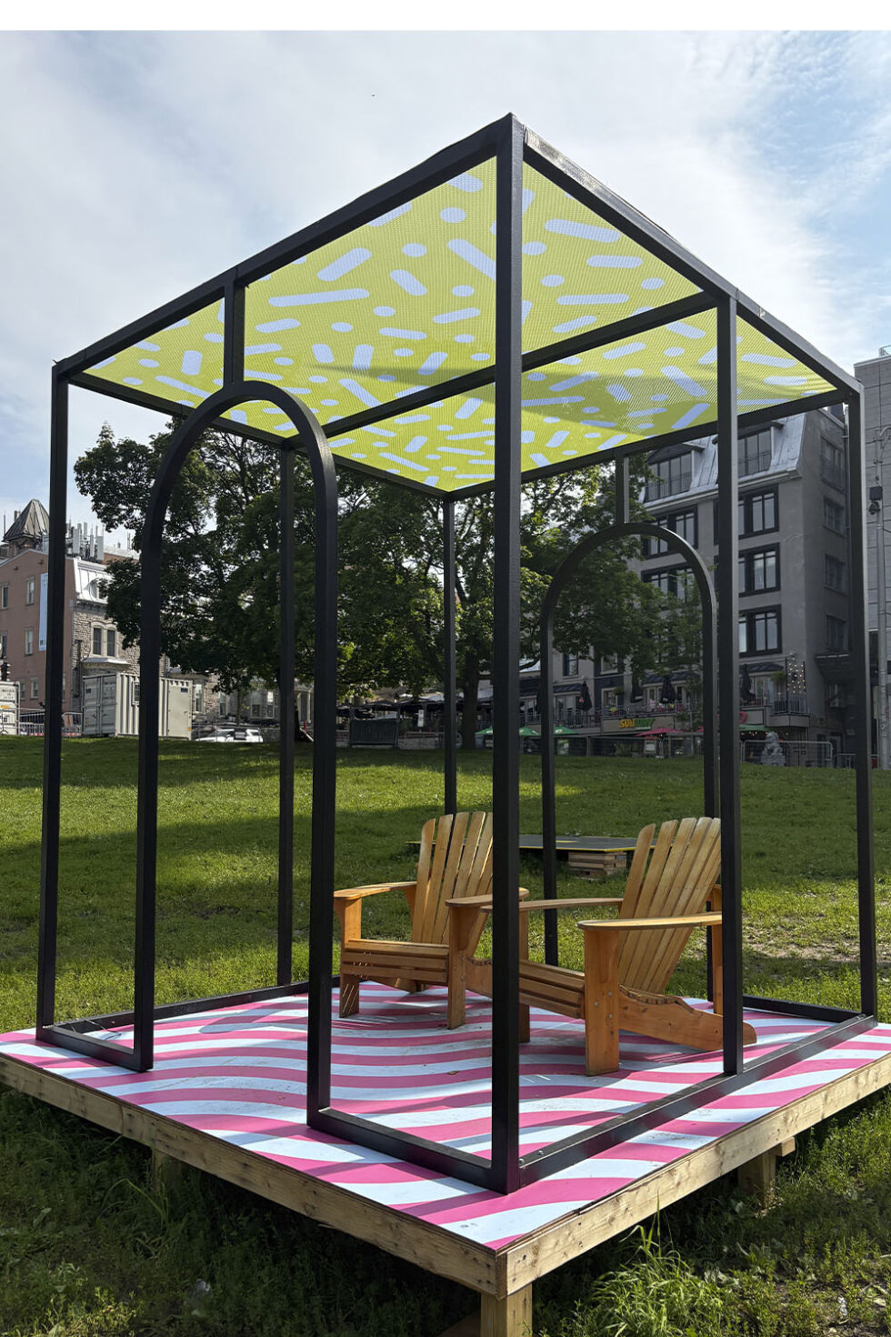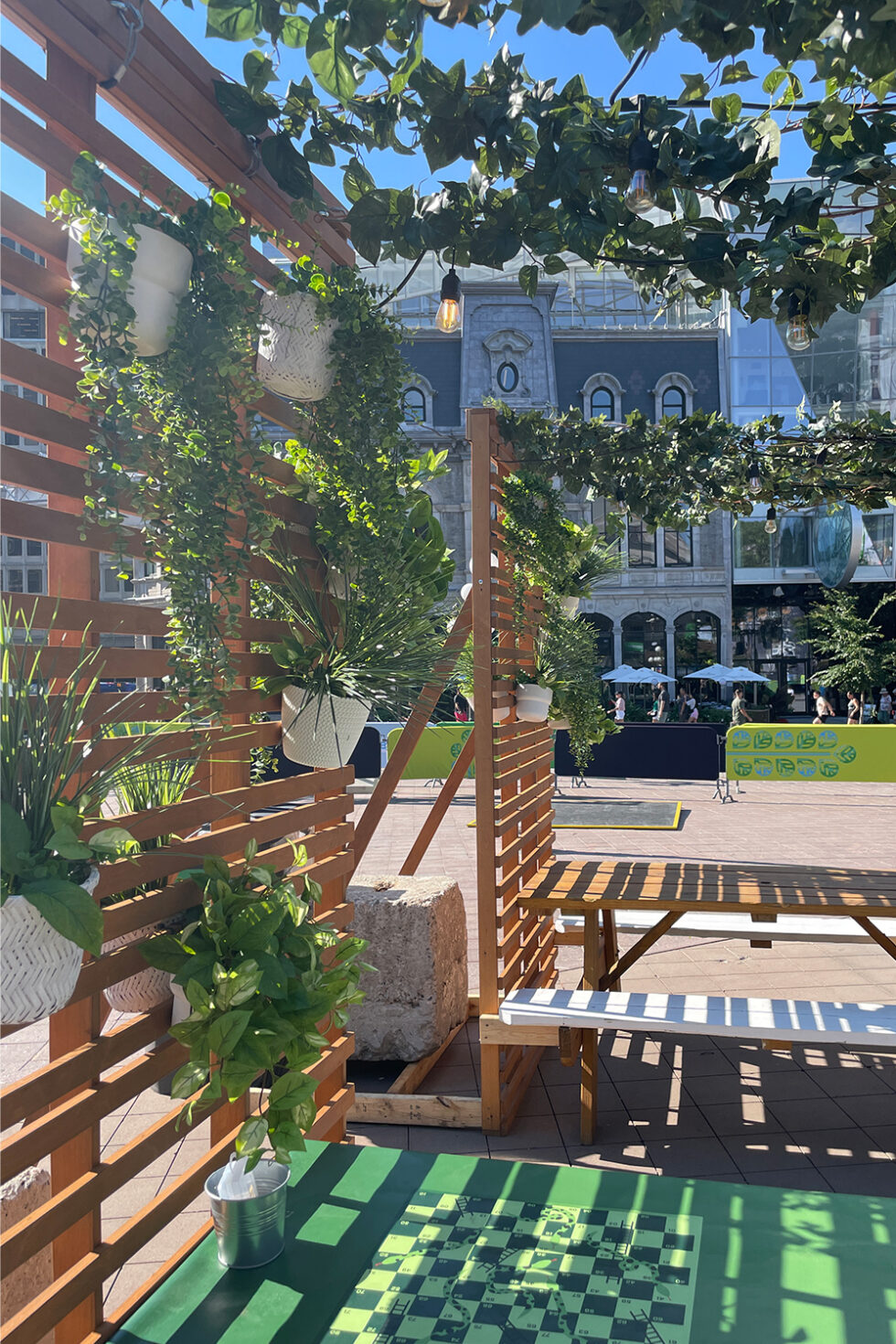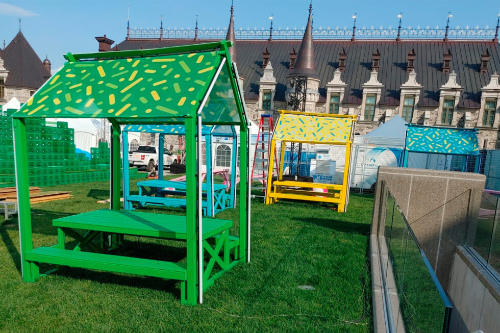 Installation d’un plafond de verdure, de jeux de tables, de palmiers et de feux de camp sur les sites de Place D’Youville, Assemblée nationale et Place George-V.
