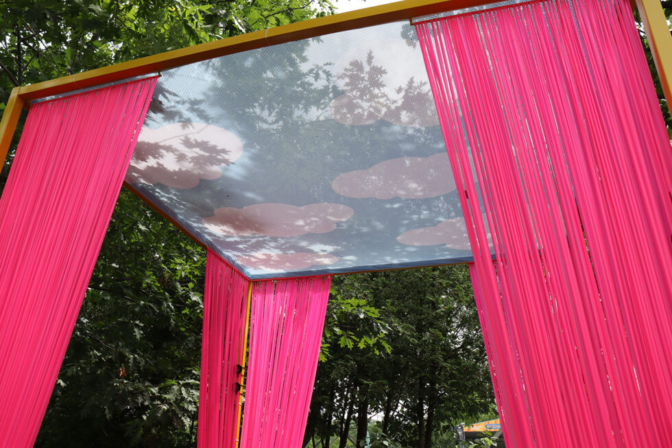 Installation de visuels sur les arches géants, bannières de motifs sur tables et toits de tissus.