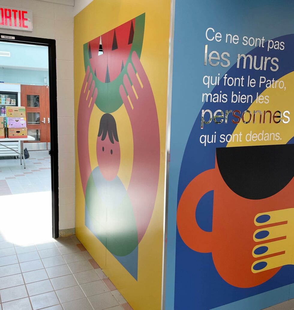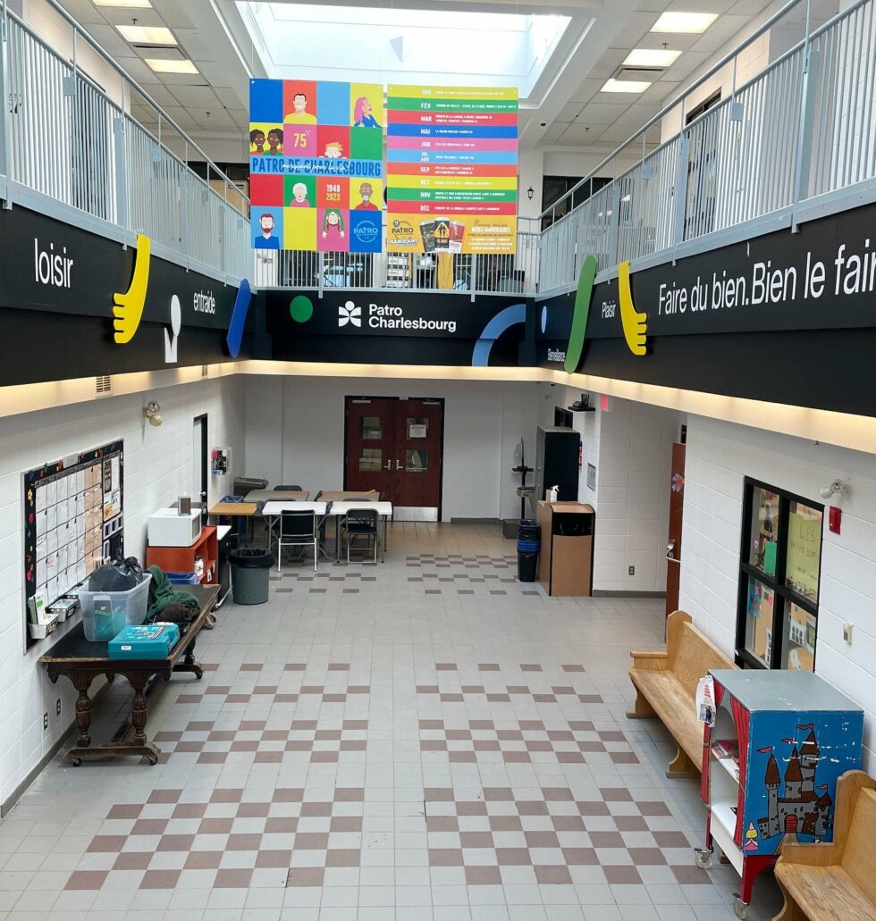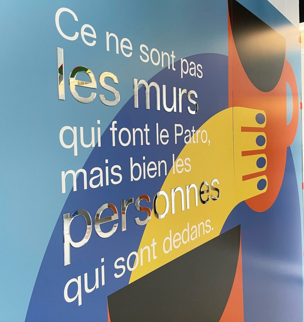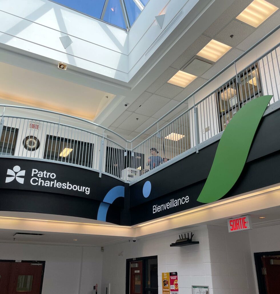 LE PATRO DE CHARLESBOURG Habillage de la mezzanine ainsi qu’une section sous l’escalier principal, dans le respect de la nouvelle image de marque du réseau Patro. 2023 Retour