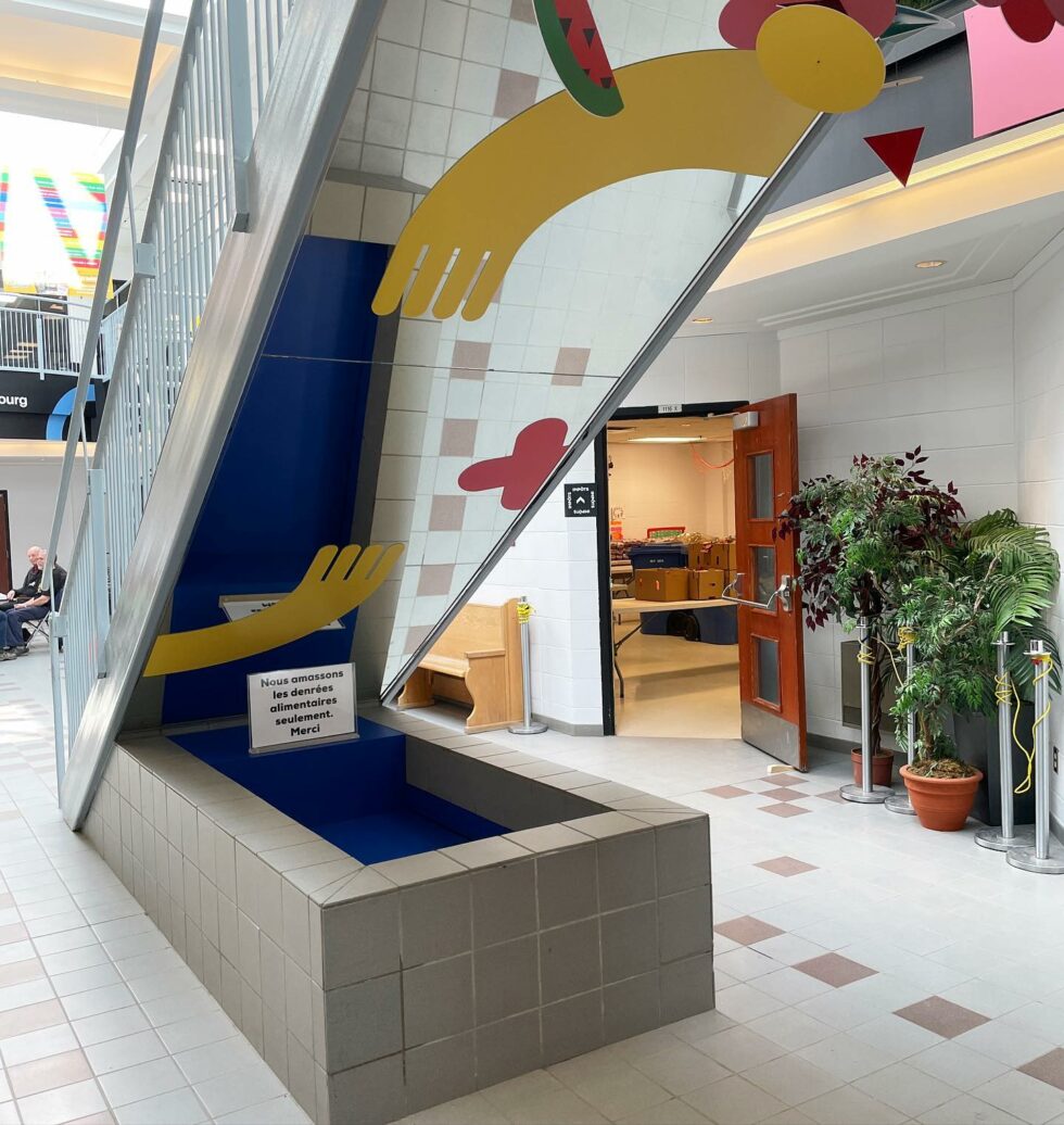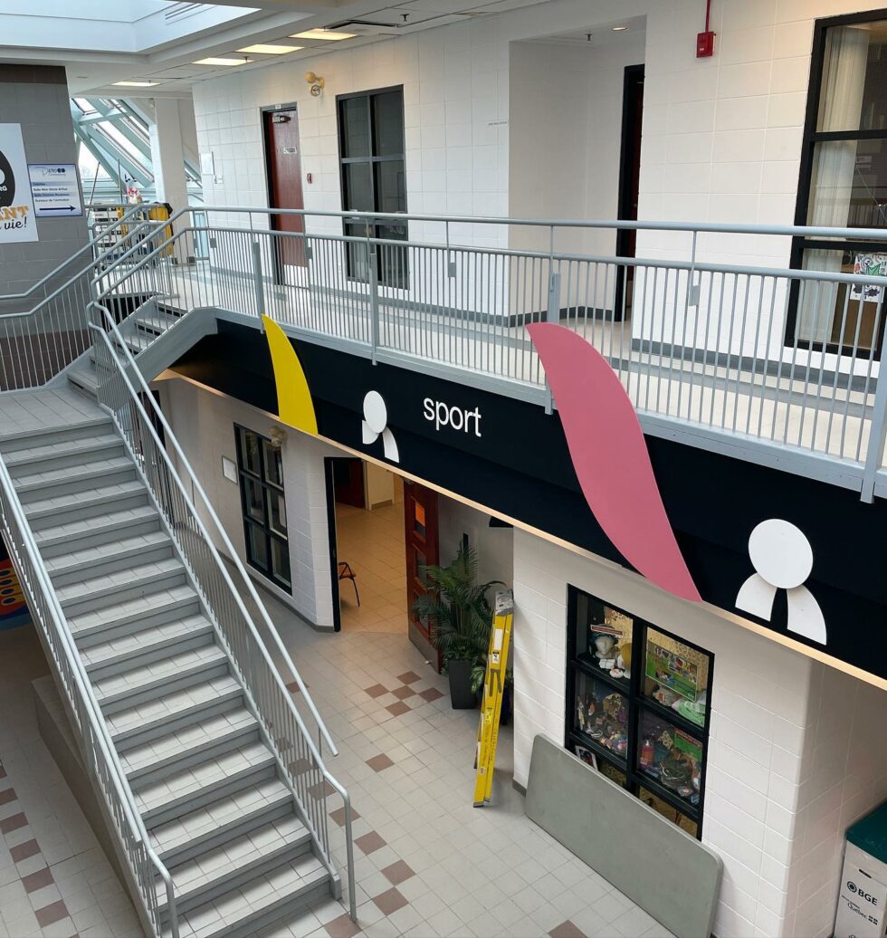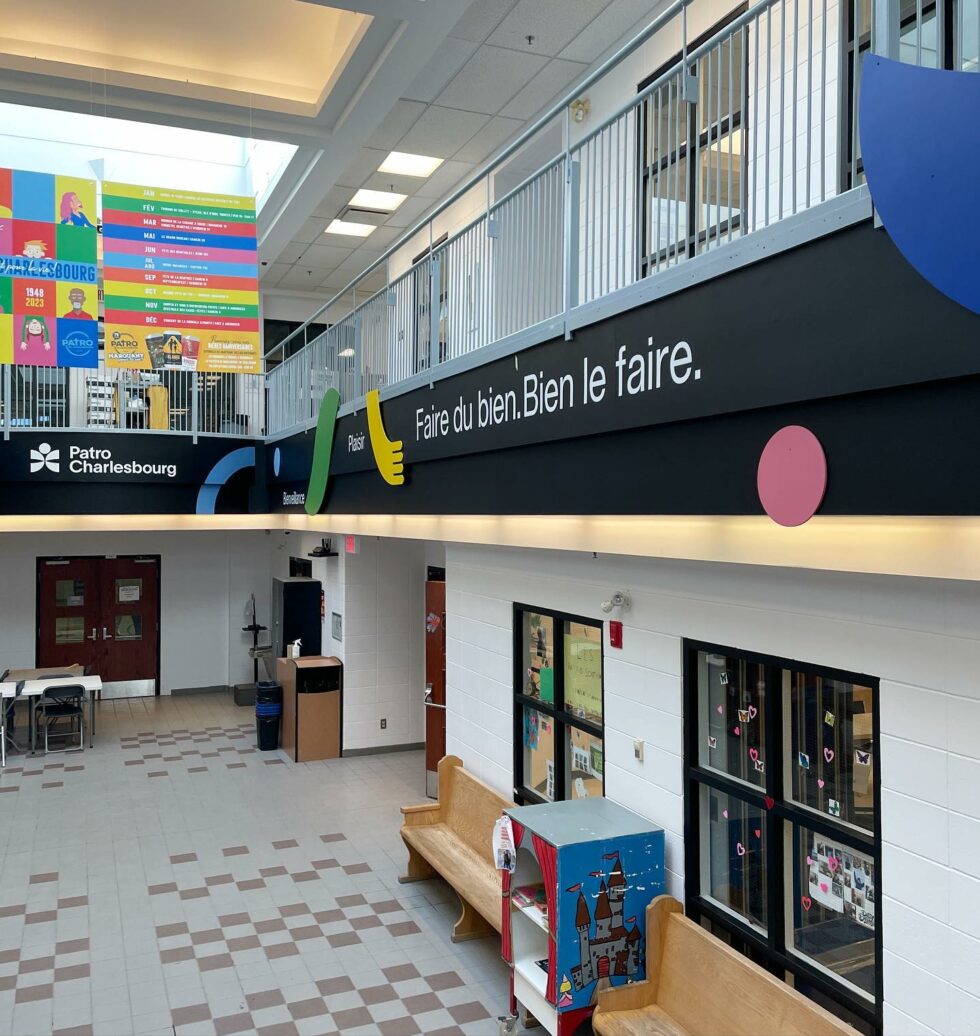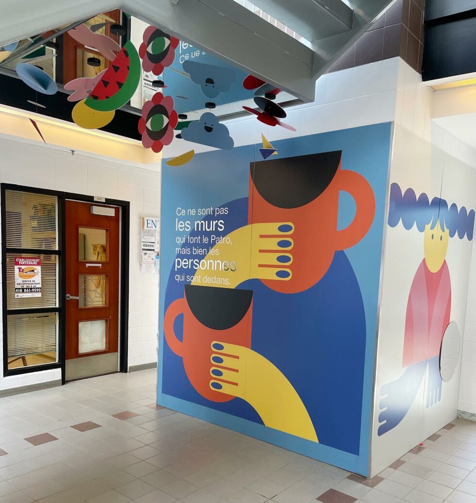 LE PATRO DE CHARLESBOURG Habillage de la mezzanine ainsi qu’une section sous l’escalier principal, dans le respect de la nouvelle image de marque du réseau Patro. 2023 Retour