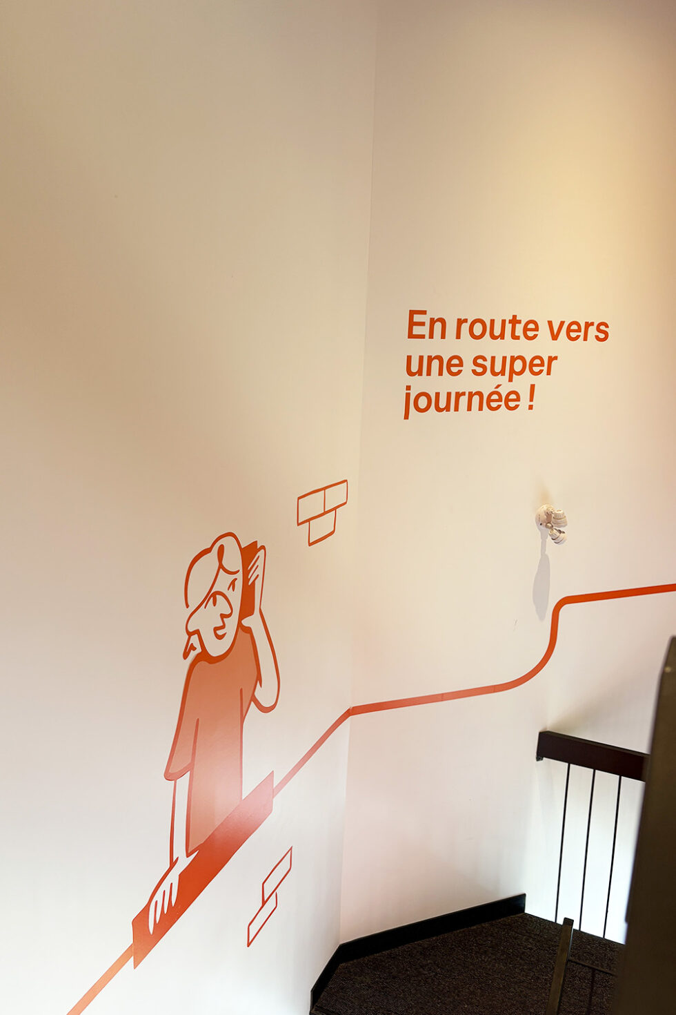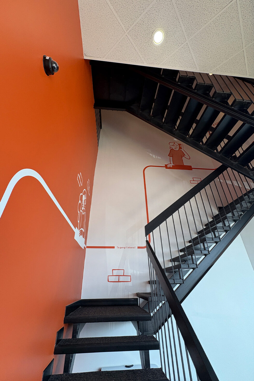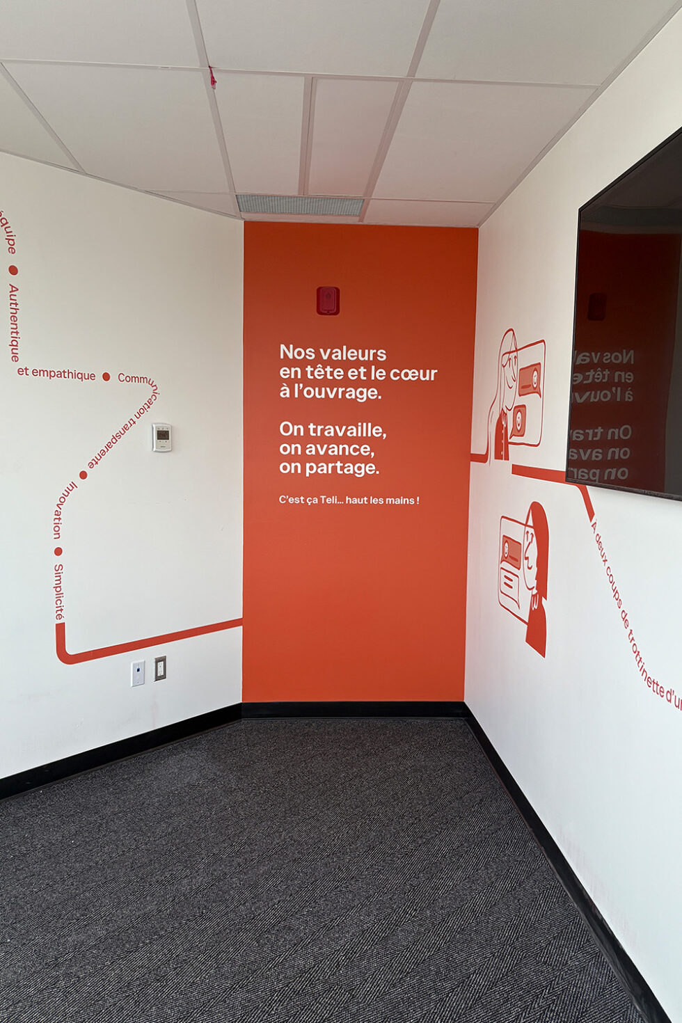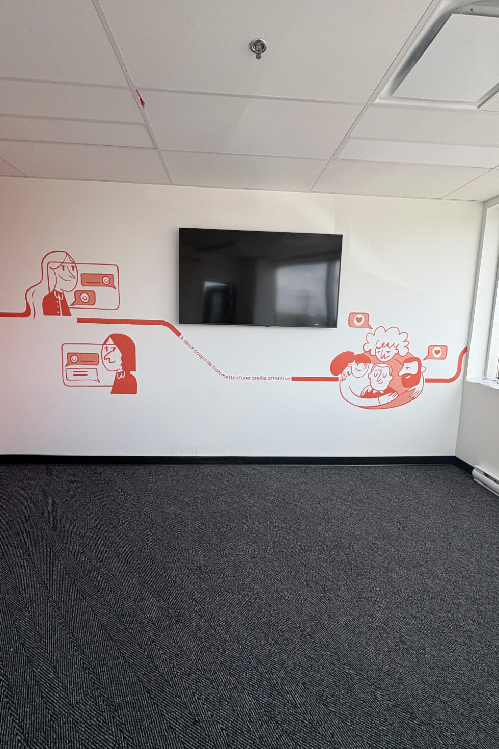 Conception de murales à partir d’illustrations corporatives habillant des aires communes du bureau de Québec. En collaboration avec Isabelle Duchaine.